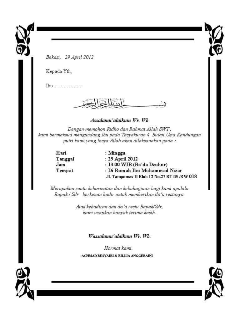 Contoh Undangan Tasyakuran 4 Bulanan - 21 Contoh Surat Undangan Resmi Tidak Resmi Rapat Pernikahan Syukuran Dll : Inilah yang anda cari tentang download format undangan 7 bulanan kehamilan doc.. contoh undangan syukuran 4 bulan kehamilan contoh isi undangan. contoh surat undangan syukuran 4 bulanan bahasa sunda. undangan tasyakuran 4 bulan kehamilan syafiqoh merupakan sebuah desain undangan untuk menyelenggarakan acara tasyakuran 4 bulan kehamilan atau yang disebut walimatul khamli atau keba. Cara membuat contoh surat undangan rapat resmi tidak resmi shunt. contoh surat undangan syukuran 7 bulan kehamilan harga viewletter co.